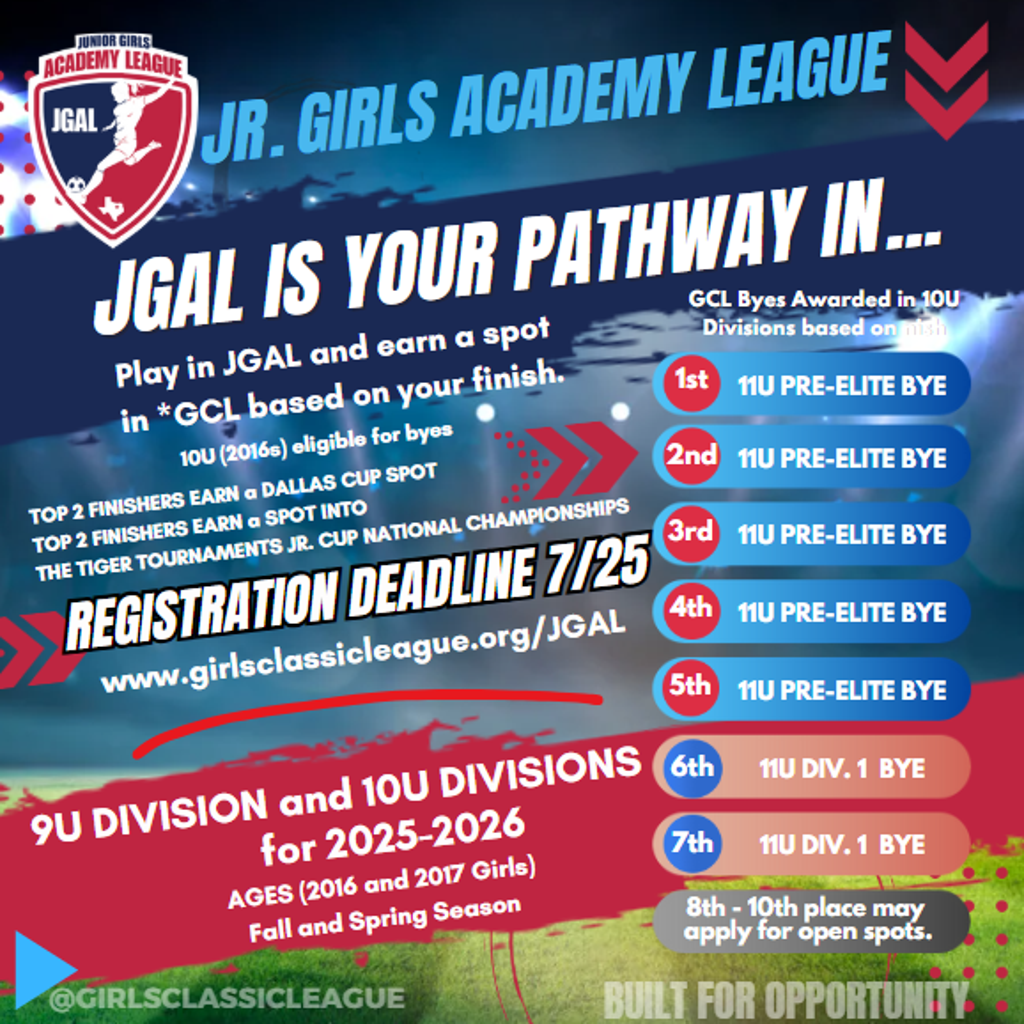 Apply today and experience Elite Academy Competition across the fall and spring. 2016 Teams can earn byes into GCL for 26/27. Both 9U and 10U Top 2 Finishers can earn a spot in Dallas Cup for the Spring 2026. Top 2 Finishers in the Fall can earn a spot in the Tiger Tournament National Championships in Las Vegas!