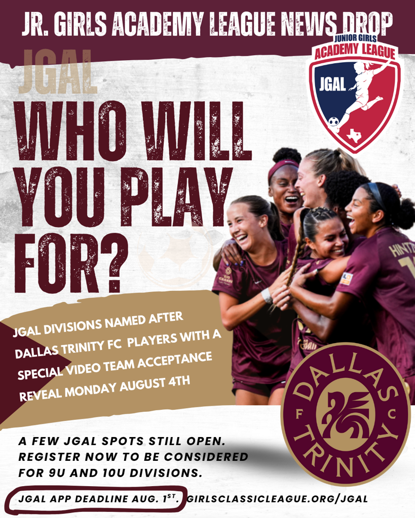 *** CLICK HERE FOR tickets and show up and cheer on your favorite Dallas Trinity FC Player August 23rd! Make sure you choose your JGAL division at checkout when purchasing your tickets. ***